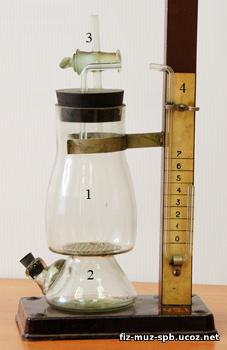 На рисунке 1 указаны основные части прибора. Сосуд сложной формы из двух частей (верхней 1 и нижней 2), между которыми положена металлическая сетка, закрыт большой резиновой пробкой 3; через последнюю пропущены трубки: стеклянная с двухходовым краном для сообщения с атмосферой, вторая резиновая предназначена для подключения к