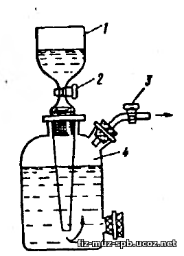| Рисунок 1. Устройство стеклянного газометра:1-воронка с краном - 2, 4 – бутыль с нижним сливом и газоотводной трубкой с краном – 3. |