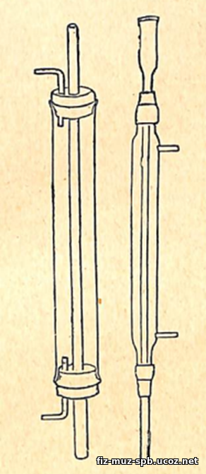 Прямоточный холодильник Либиха (рис. 2 справа) в начале ХХ века выпускался также в упрощенном виде (рис. 2 слева). Преподаватели по изображению из каталога, где обычно указывался масштаб, могли изготовить дешёвые самодельные приборы (рис. 1).