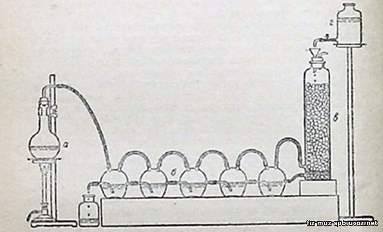Рисунок 1. Внешний вид поглотительной системы модели: слева колонна, соединенная с тремя сообщающимися сосудами. В последнем сосуде (справа) имеются два резиновых отвода: верхний для поступления газа, нижний для сбора соляной кислоты.