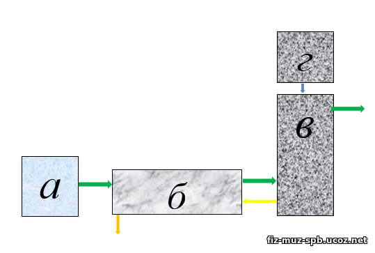 | Рисунок 3.Схема модели завода соляной кислоты. Цветные стрелки показывают направление движения газа (зеленые), раствора (желтые), воды (синяя). Буквы совпадают с обозначениями на рис. 2. |