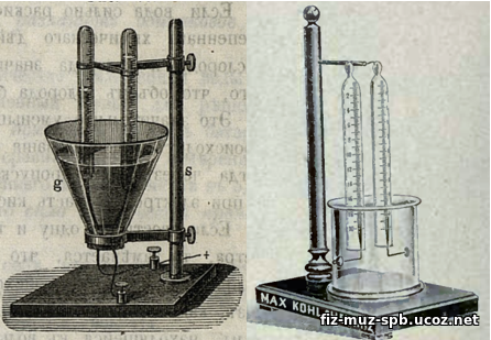 | Рисунок 1. Вольтаметры с разным креплением электродов, возле которых собирается газ: слева- электроды припаяны к проводам, пропущенным через пробку. Справа-электроды впаяны в стеклянный сосуд |