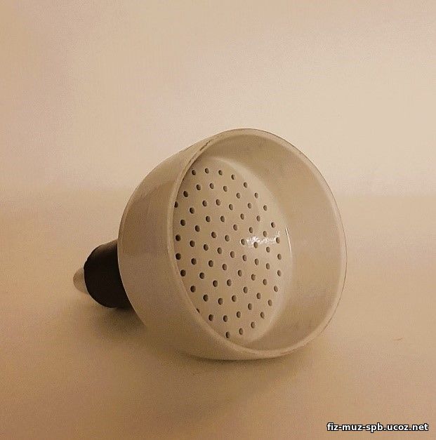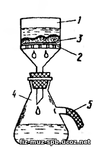 | Рисунок 2. Фарфоровая воронка Бюхнера[1] с перегородкой применяется для фильтрования растворов под уменьшенным давлением. Длина 13 см, диаметр 8 см. Изготовлена на Речицком фарфоровом заводе 1960-1970 гг. | Рисунок 3. Установка для фильтрования под вакуумом: 1-воронка Бюхнера, 2- перегородка, 3-фильтровальная бумага, 4-колба Бунзена, 5-шланг к насосу. |