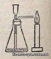 Конические колбы Эрленмейера несколько устойчивее, поэтому они очень удобны для собирания фильтрующихся жидкостей; в остальном эти колбы «равноправны» с другими плоскодонными колбами. Например, для устройства взрыва (рис.3). на дно конической колбы насыпают смоченные водой кусочки цинка; колбу плотно закрывают пробкой, в которую пропущены воронка и Г-образная трубка, повернутая к горящей свече. После этого в воронку приливают кислоту. Через некоторое время из Г-образной трубочки начнет выходить водород с воздухом, что приведет к взрыву.