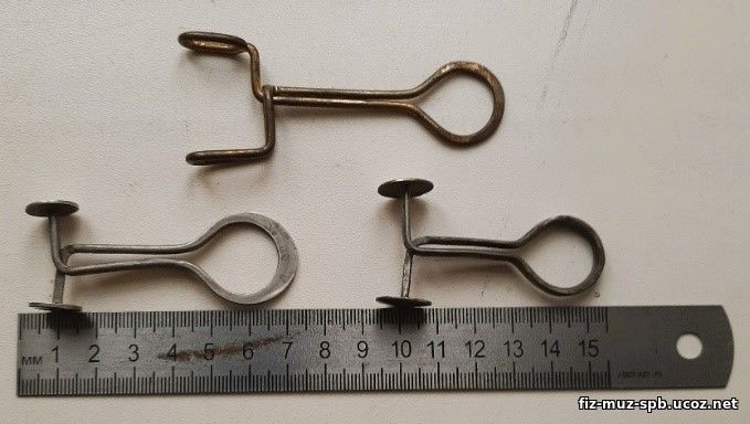 Винтовые зажимы Гофмана (1818-1892) бывают простые и с откидной пластиной; последние могут иметь длину 2-4 см, что определяет величину всего зажима. |