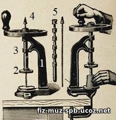 После осмотра прибора стало понятно, что с вращением ручки вращается металлическая полая трубка с заостренным краем – сверло. В сверле сохранились остатки каучуковой/резиновой пробки. Позднее по немецкому каталогу учебного физического оборудования начала ХХ века было определено точное название и назначение прибора (рис.2).
