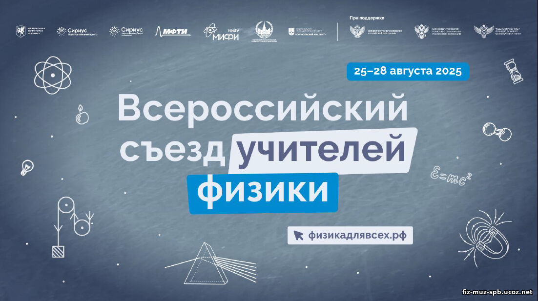 ВСЕРОССИЙСКИЙ СЪЕЗД УЧИТЕЛЕЙ ФИЗИКИВсероссийский съезд учителей физики (далее Съезд) организован Московским физико-техническим институтом, Образовательным центром «Сириус», Московским государственным университетом имени М В Ломоносова, Национальным исследовательским ядерным университетом «МИФИ», Национальным исследовательским центром «Курчатовский институт», Научно-технологическим университетом «Сириус» при поддержке Министерства просвещения Российской Федерации, Министерства науки и высшего образования Российской Федерации и Федеральной службы по надзору в сфере образования и науки Съезд прошел на Федеральной территории «Сириус» в соответствии с Планом мероприятий по развитию инженерного образования, утвержденным совместным распоряжением Минобрнауки России и Минпросвещения России от 26 апреля 2023 г. № 178 р/Р 92.