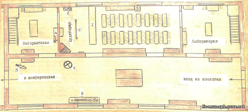 Таким образом, аудитория, отмеченная на плане, ранее была кабинетом физики в Педагогическом музее военно-учебных заведений.