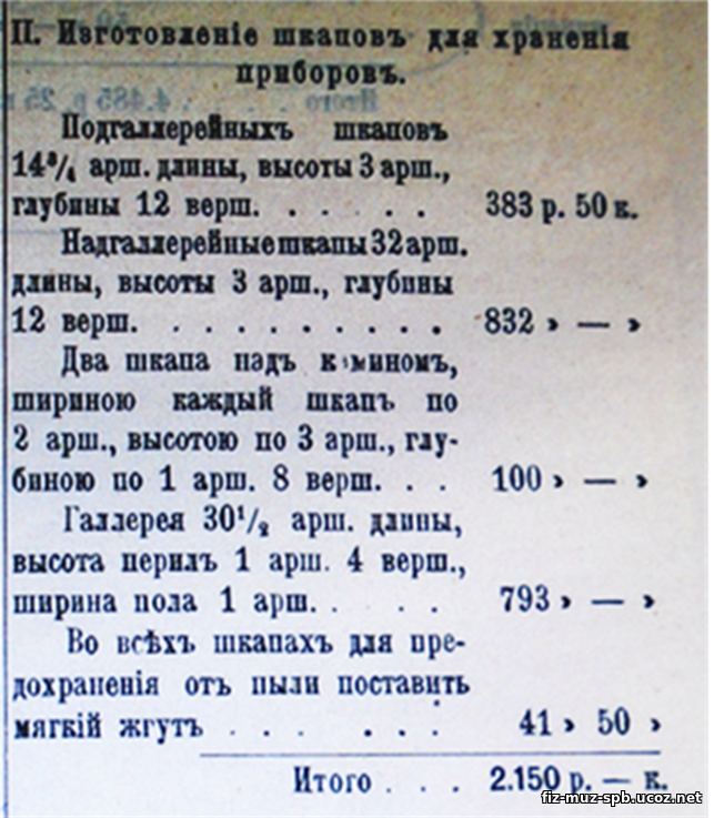 Информация о размерах шкафов и галлереи, содержащаяся в расчете суммы, позволяет желающим, хотя и очень примерно, оценить высоту и ширину кабинета физики.
