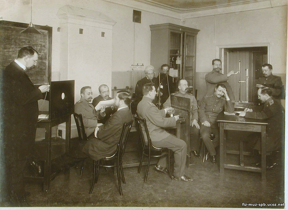 VI. Фотография, представленная ниже, относится к периоду (1900 – 1914гг), когда при Педагогическим музее В.У.З. проводились курсы по подготовке офицеров, готовящихся к исполнению обязанностей преподавателя физики в кадетских корпусах. На курсы принимались военные и гражданские лица, имеющие высшее образование, в количестве 12 человек. Обучение продолжалось два года. Занятия по физике бессменно курировал