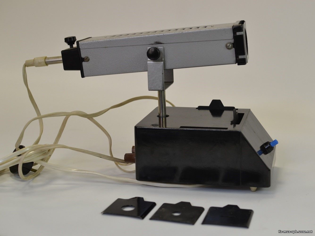 На рисунке 3 показан осветитель ОИ-19 производства завода № 357 (Прогресс), Ленинград. Прибор предназначен для освещения препаратов и является принадлежностью биологического микроскопа. Фонарь осветителя снабжен ирисовой диафрагмой, оправой для фильтров, двухлинзовым коллектором и блоком питания на 220/8 В. Сотрудники кабинета физики СПБ АППО его применяли для теневого проецирования и подсвета, т.к. фонарь осветителя можно поворачивать вокруг горизонтальной и вертикальной осей от 0 до 360 градусов.