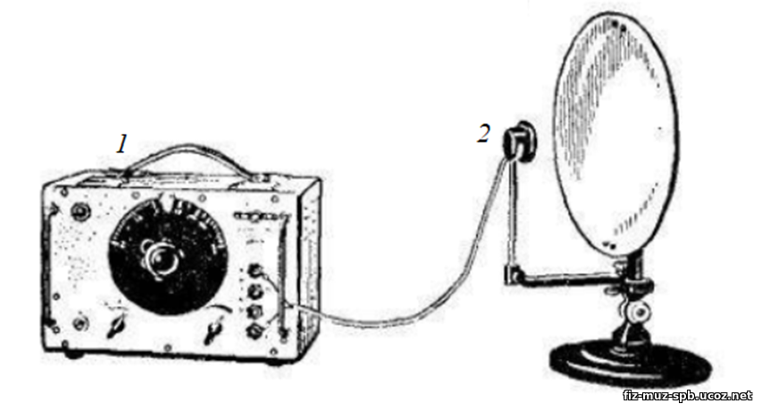 2. На рисунке показана установка для демонстрации «Звуковой прожектор», где цифрой 1 обозначен звуковой генератор, позволяющий менять частоту звуковых колебаний; цифрой 2 – телефон от наушников. Опираясь на материал статьи о зеркалах Пикте и знание физики, выполните несколько заданий: