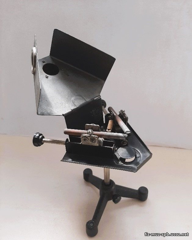 В устройство малой дуговой лампы входят: специальный станок с угольными электродами для создания вольтовой дуги, регулятор дуги с клеммами для подключения автономного источника тока и оптическое стекло для получения параллельных лучей света.