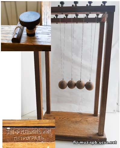| Рисунок 1. Рама с шарами. Общие габариты установки в см: 32×20×57. Диаметр шаров 5 см. На основании прибора желтой краской поставлен номер 190. Прибор изготовлен в мастерских товарищества преподавателей «Ф. Ильин и Ко», Разъезжая 10, Петроград. 1914-1920. |