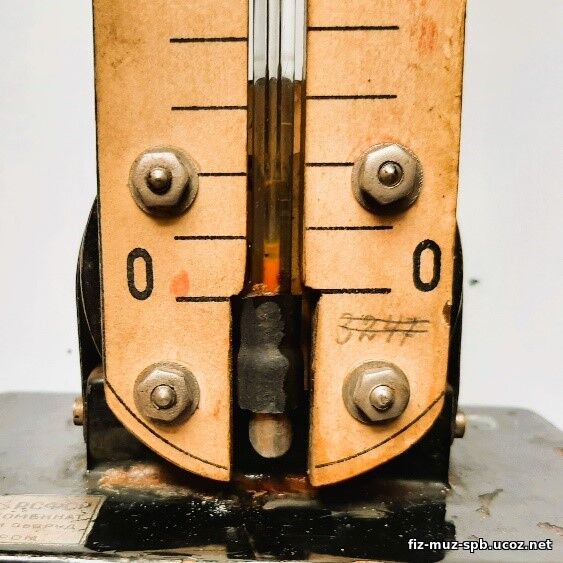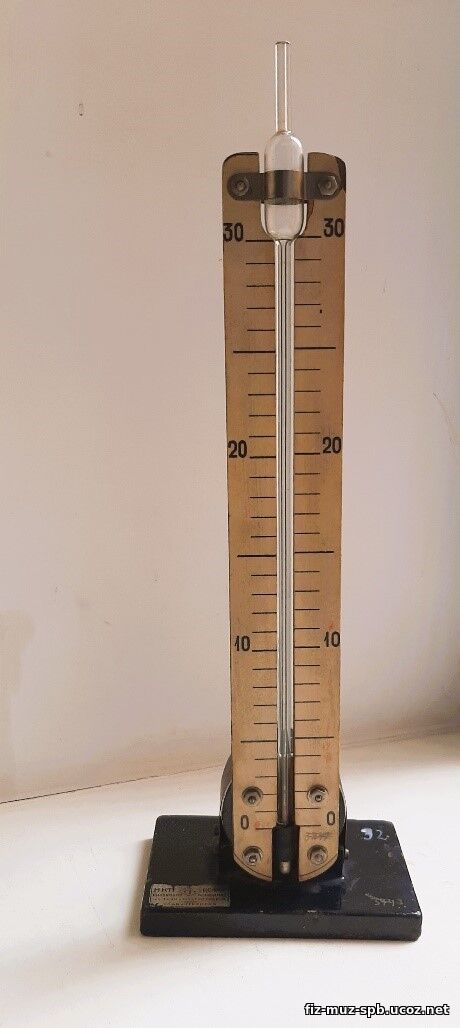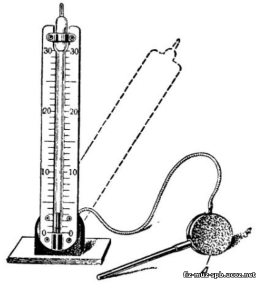 теплоприемником составляли прибор «Термоскоп». Собственно, манометр состоит из трех элементов: металлическая цилиндрическая коробочка, манометрическая стеклянная трубка с расширением в верхней части, и шкала на деревянной основе с ценой деления 1 см.