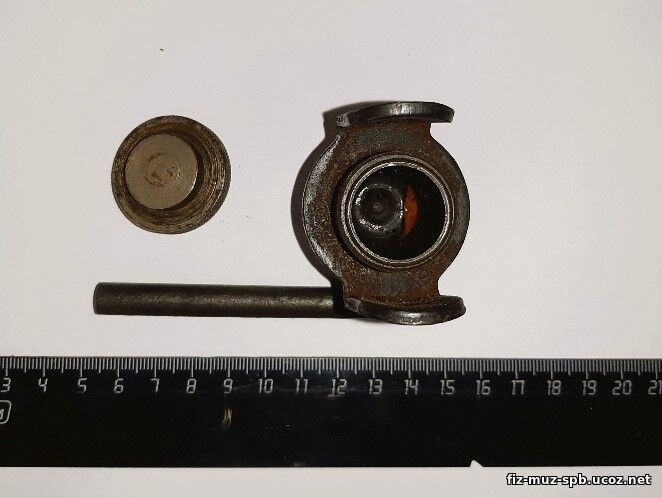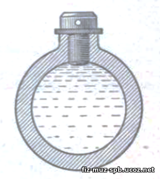 Назначение: для демонстрации силы давления, действующей на стенки сосуда при замерзании воды. Устройство: стальной толстостенный цилиндр с наружной резьбой в верхней части; закрывается стальной крышкой с опорной призмой в навершии; на внешнюю резьбу навинчивается скоба. В скобе имеются два сквозных отверстия для установки чугунного стержня.