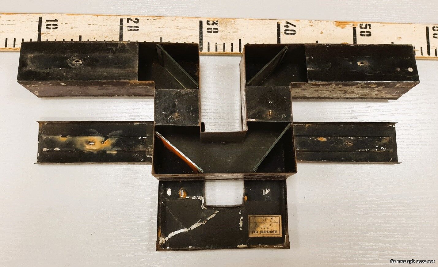 | Рисунок 3. Внутреннее устройство зеркального перископа. Внутренняя полость короба и крышки выкрашена черной краской. На внутренней поверхности крышки видна инвентаризационная бумажная наклейка, указывающая на принадлежность прибора к коллекциям Педагогического Музея В.У.З. |