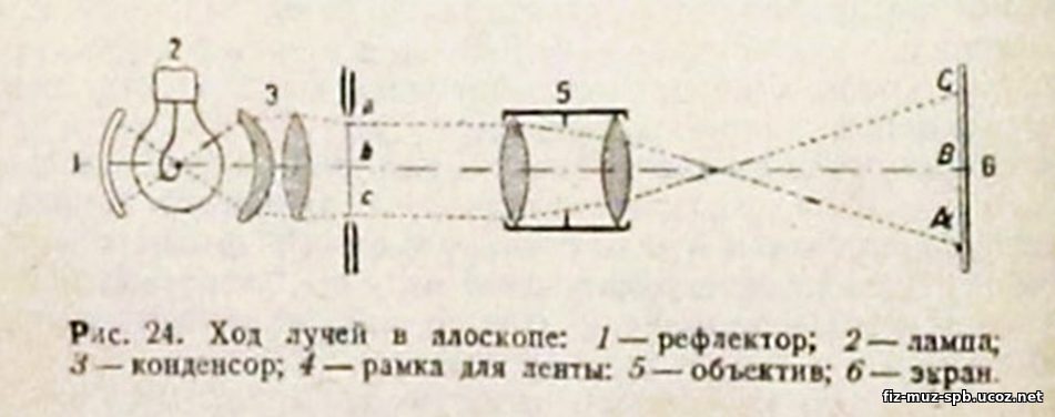 На рисунке 5 показаны оптическая система и ход лучей в алоскопе из руководства Горячкина. Там же дано предупреждение об особенностях работы при демонстрации диафильма: 1) не задерживаться долго на показе одного диапозитива из-за горючести пленки; 2) никогда не закрывать прорезей и боковой дверцы осветителя (рис. 2 и 3), служащих для циркуляции воздуха.