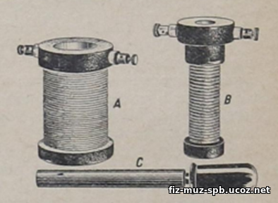 | Рисунок 1. «Индукционная» катушка А, В и сердечник, который состоит из пучка железных отожженных проволок. |