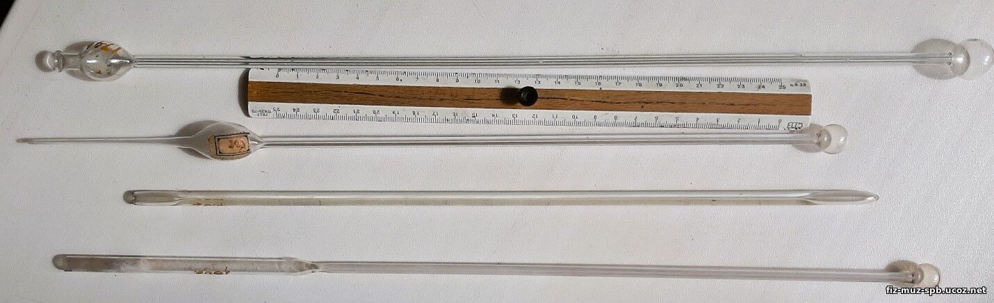 В фондах физического отдела музейно-педагогического центра СПб АППО хранятся несколько трубок, имеющих общие признаки: довольно длинная капиллярная трубка, с открытого конца которой имеется воронка, на другом конце - небольшой резервуар. Сходство с конструкцией термометра очевидно, поэтому необходимо было понять для каких учебных целей предназначались эти предметы. Естественно было обратиться к русским учебникам физики для гимназий второй половины XIX века Э. Ленца (1856) и К. Краевича (1868) и др. После изучения «стабильных» учебников физики сложилось общее представление о процессе приготовления ртутных термометров: 1 шаг- создание заготовки. Выбирают стеклянную трубку, у которой внутренний диаметр очень мал и притом по всей длине трубки одинаков. Один конец трубки сильно разогревают так, чтобы стекло начало плавиться; запаивают этот конец, а в другой конец дуют — от этого образуется шарик. К открытому концу припаивают маленькую воронку (рис.1 трубки 1, 2, 4). 2 шаг – заполнение заготовки ртутью. В воронку наливают ртуть; ртуть только немного войдет в трубку, а в шарик вовсе не войдет. Чтобы заставить ртуть войти в трубку, ее держат в наклонном положении и слегка нагревают на спиртовой лампе; затем прибор охлаждают и процедуру повторяют пока шарик с трубкой не заполнятся ртутью. 3 шаг – запаивание трубки. Воронку отламывают и прибор нагревают до температуры, выше которой не предполагают проводить измерение. Ртуть начинает выливаться, тогда запаивают трубку (рис.2).
